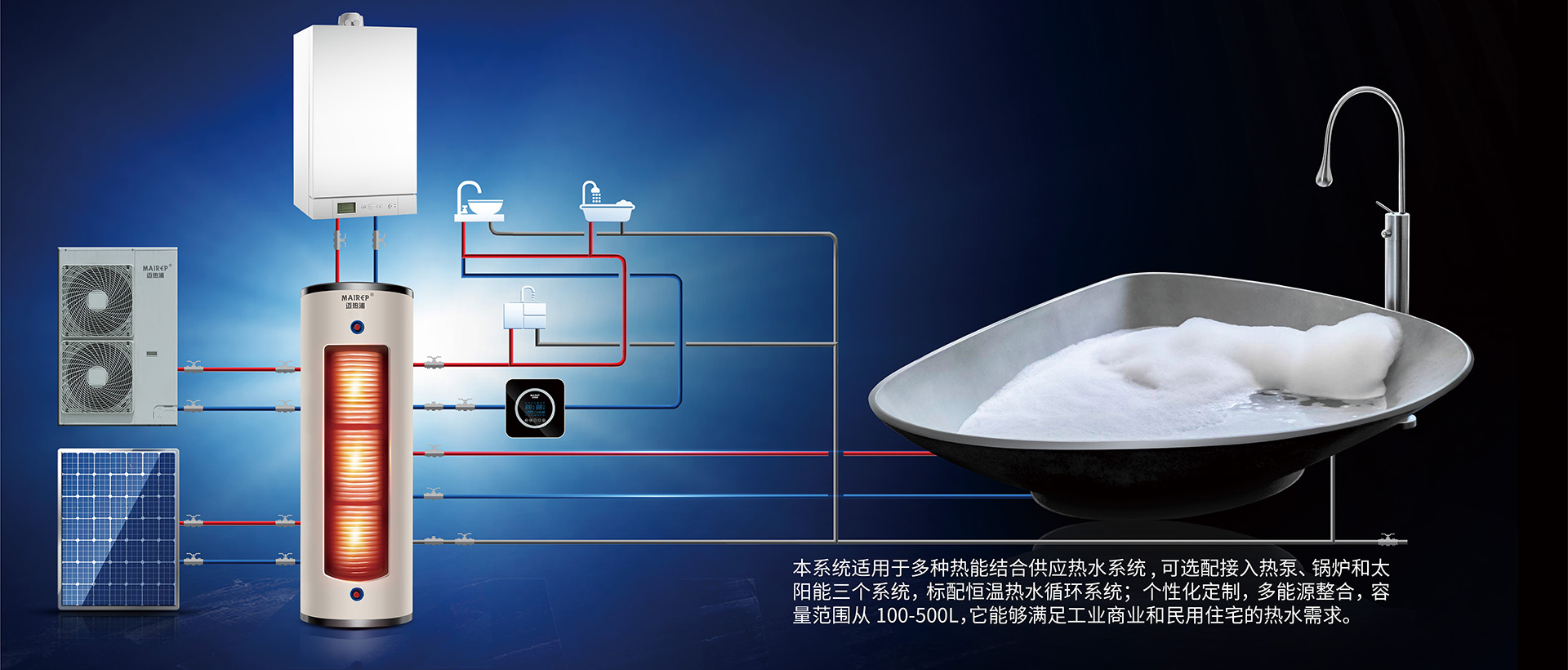 邁熱浦中國工廠致力于銅盤管承壓水箱、平板太陽能系統及空氣源熱泵的水箱設計生產;在生命歷程中,邁熱浦中國太陽能熱水箱、熱泵熱水箱、鍋爐換熱水箱、地暖供暖配件等領域走過新的生命歷程,解決數萬家庭熱水系統方案,目前我司把太陽能、熱泵和天然氣鍋爐良好的結合,讓太陽能技術廣泛應用于生活熱水與地板采暖,改善人類對美好生活的需求,追求更優越的品質生活。